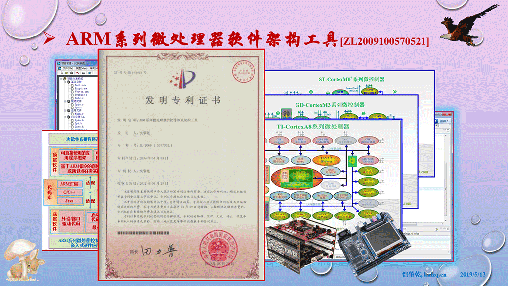 ZL2009100570521-- ARM系列微处理器软件架构工具,发明专利,2009-4申报,2012-6授权。用于主流通用各类半导体微控制处理器厂家的Cortex-M 系列、Cortex-A系列、ARM11、ARM9、ARM7等内核软件体系及其RTX、μC/OS、ARM-Linux等嵌入式实时操作系统的快速构造,可以大大减少开发周期,降低研发成本和入门门坎,增强系统的可靠高效性,推动嵌入式电子产品快速上市。已经推出十余款架构工具。
